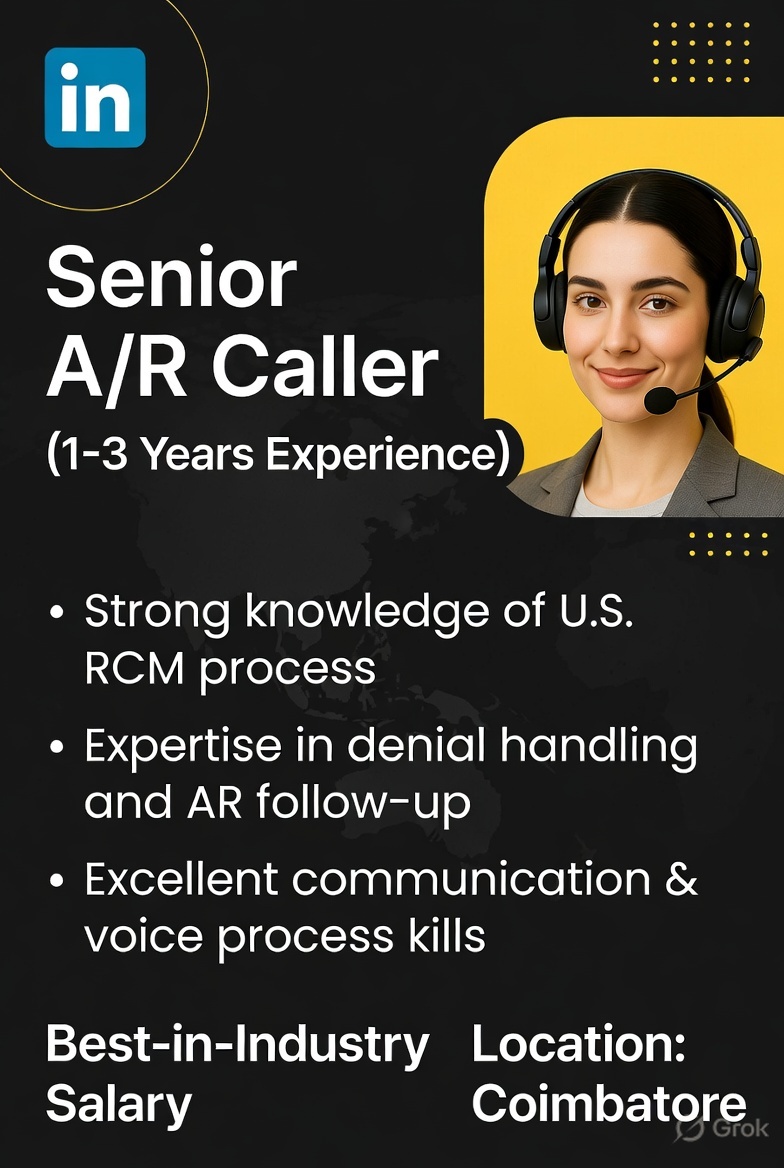 ICS is hiring Senior A/R Callers with experience in U.S. medical billing and revenue cycle management (RCM). Candidates must have strong communication skills and hands-on experience handling denial management and AR follow-ups.
